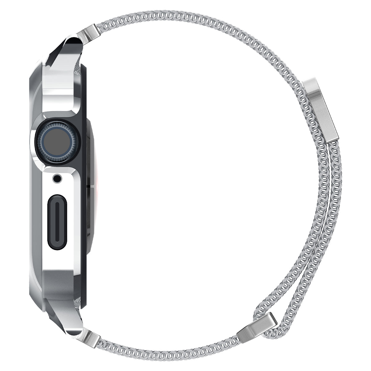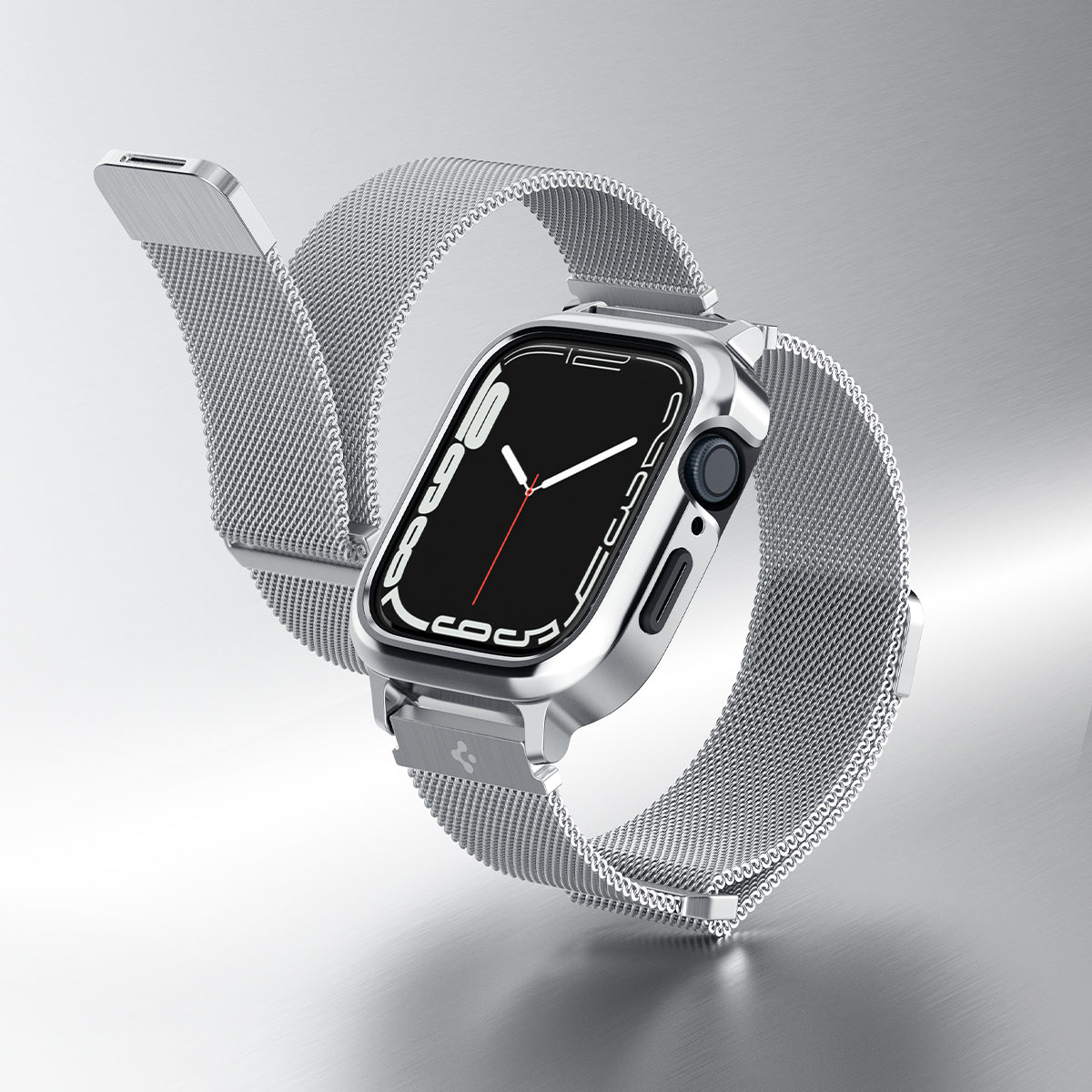 Spigen Metal Fit Pro unibody designed for Apple Watch Case with Band, frame made from aluminum and lined with TPU for durability. Premium Milanese unibody watch band made from steel for style and comfort. Precise cutouts for Digital Crown and side button. Magnetic clip slides through buckle for a secure fit.