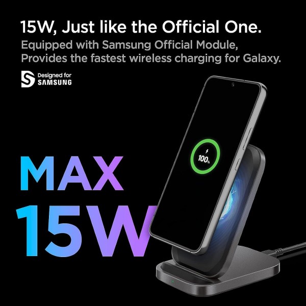 The world's first wireless charger got ‘Designed for SAMSUNG’ certification. It perform Samsung Super Fast Wireless Charging (Max 15W). Also combined with Spigen technologies, it provide great charging experience. This wireless charger will be the best option for Galaxy Fans.