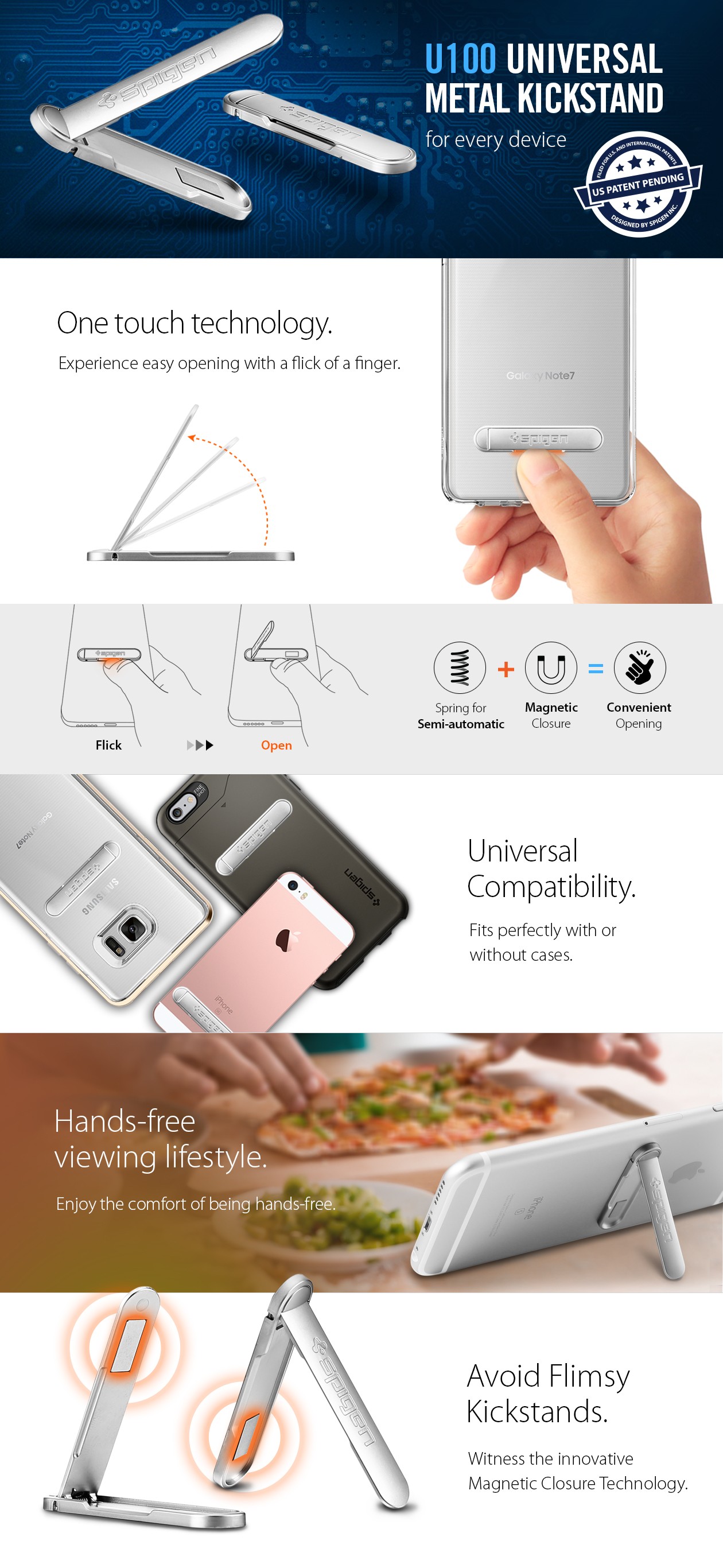 The Spigen U100 Universal Metal Kickstand has been designed for consumers who are in need of an innovation that captivates the hand-free experience with a mobile device. It is easily attachable to any mobile devices and phone cases and has the one-touch technology, which features the semi-automatic spring tension, enabling effortless opening. Experience our pioneering kickstand that will undoubtedly lead to a more convenient mobile lifestyle.