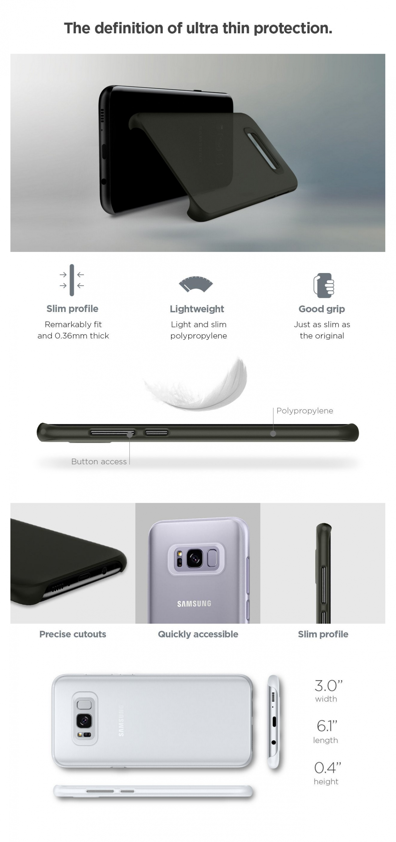 AirSkin™, the thinnest among our case collection, was crafted for the true minimalist in mind. It measures only 0.36mm in thickness and the secret to its extremely thin and lightweight design is its polypropylene build. AirSkin™ comes with a frost finish for ultimate fingerprint-resistance and comfort at every grip. Keep the feel of the original Samsung Galaxy S8 but with a layer of protection with the AirSkin™!
