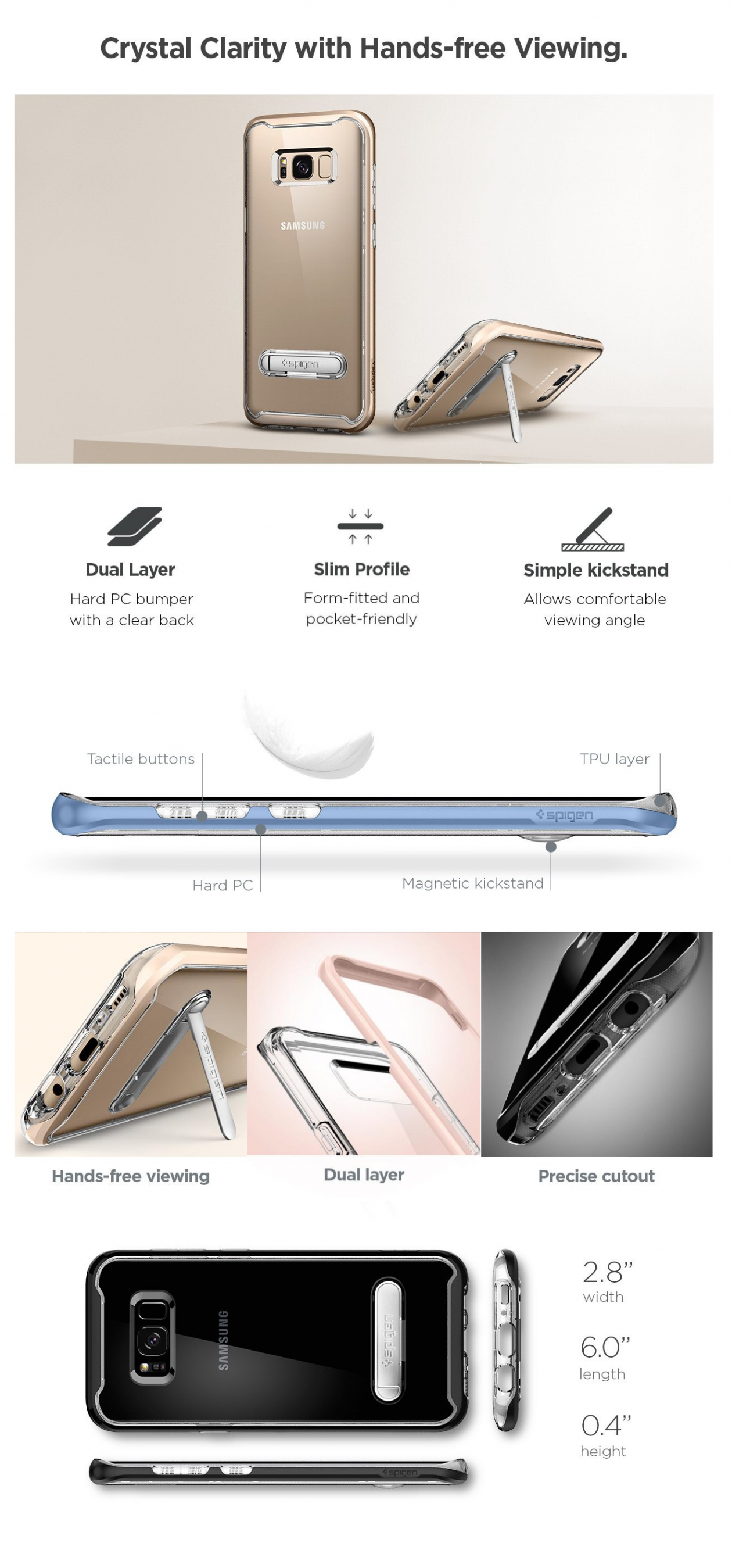 Spigen Crystal Hybrid™ is ideal for minimal enthusiasts that value maximum functionality! As mentioned in its name, the Crystal Hybrid™ is ideal in showing off your new Samsung Galaxy S8 through its crystal clear PC back while also promising extraordinary protection with the combination of its dual-layer hybrid protection. This particular Samsung Galaxy S8 case design also adds convenience to viewing experiences because it embeds our best-selling magnetic kickstand that springs up in one easy flick. Our Crystal Hybrid™ includes everything you need in a phone case - protection, style and functionality!