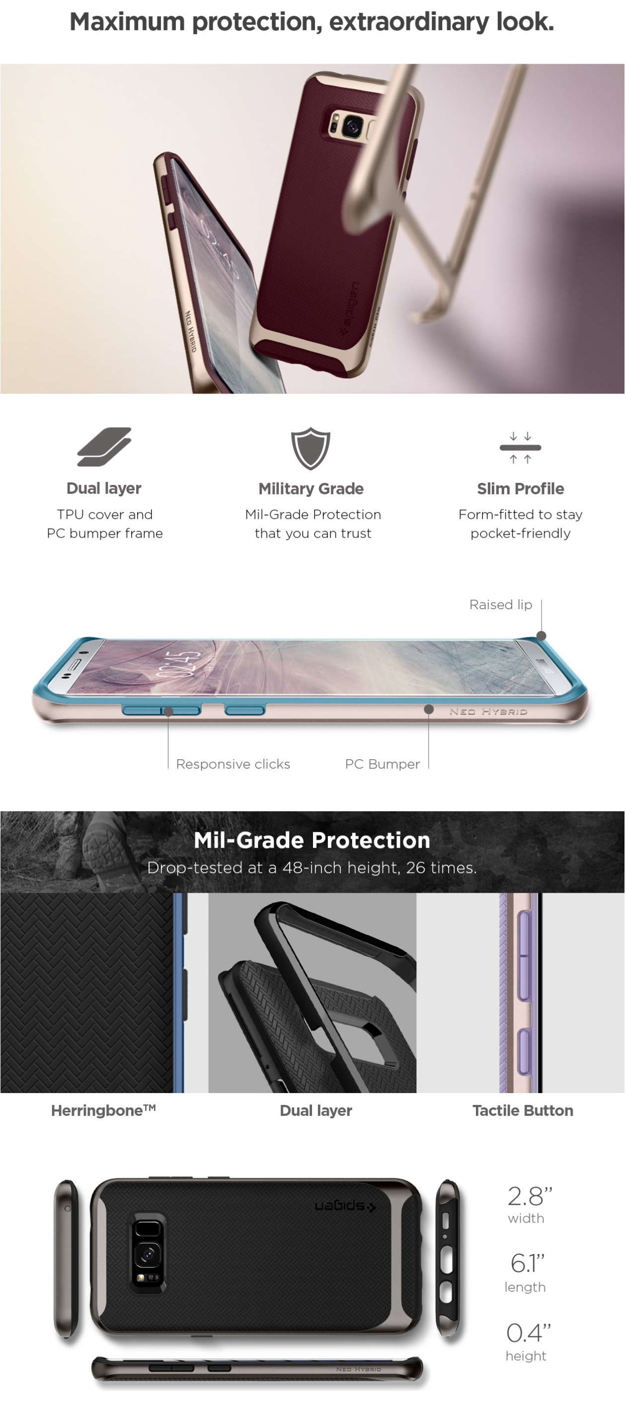 The new Neo Hybrid™ for Samsung Galaxy S8 is the future of all cases - possessing maximum protection with an extraordinary look. For optimum defense, the Neo Hybrid™ is designed to absorb shock with its TPU layer and handle impacts with its PC bumper. Precise cutouts ensure easy access to all features while tactile buttons ensure haptic feedback. The latest Neo Hybrid™ design features a reinforced bumper frame with a newly-designed herringbone pattern.