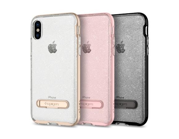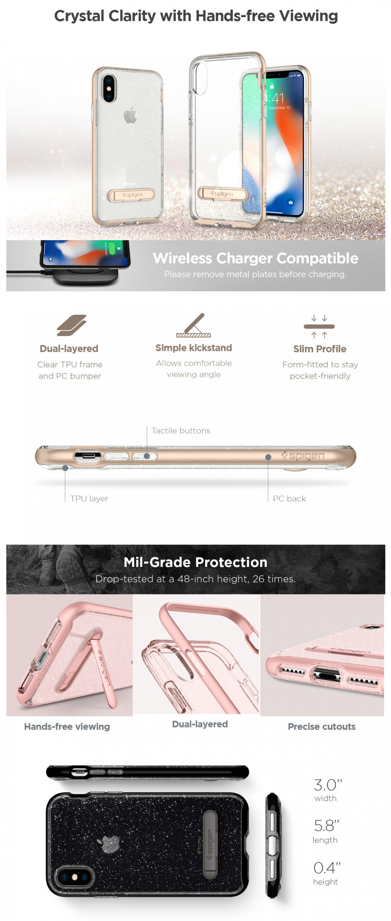 Give the iPhone X a bit more sparkle with Spigen Crystal Hybrid Glitter™. The back is made of a clear and flexible material to showcase the phone with sparkling gold flecks. The bumper frame precisely guards edges all-around to defend from all drops or everyday scratches. It comes with a built in kickstand for convenient hands-free reading and watching. The Crystal Hybrid Glitter™ has everything you need with practical protection, style, and functionality.